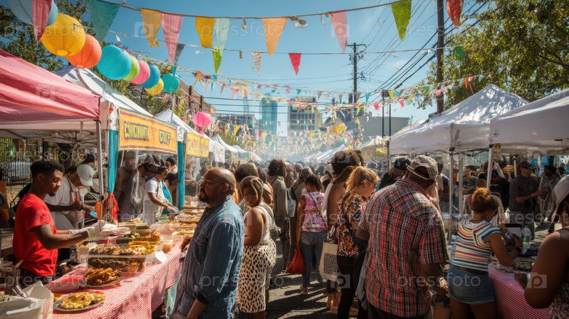 Вибрирующий пищевой фестиваль с разнообразными блюдами и радостными участниками, наслаждающимися кулинарным опытом