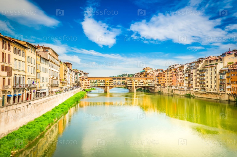 Мост Ponte Santa Trinita и мост Ponte Vecchio со средневековыми домами над рекой Арно, Флоренция, Италия