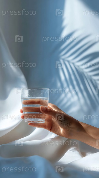 Прохладный и освежающий стакан воды, грациозно расположенный рядом с пальмами под теплым солнечным светом