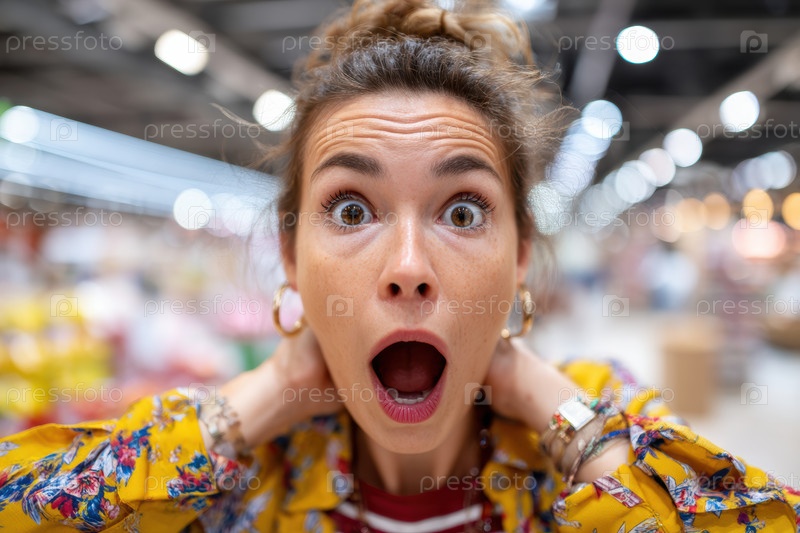 Женщина выглядит приятно удивленной в продуктовом магазине, который окружен яркими свежими овощами и красочными фруктами