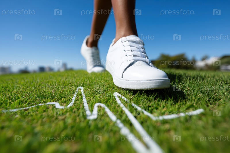 Женщина в оранжевом наряде элегантно прогуливается по живописному поле, а график сердечных сокращений перекрывает сцену
