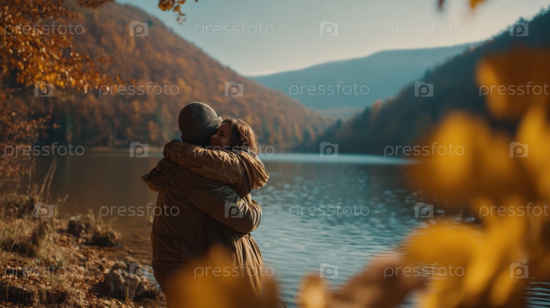 Уютная пара наслаждается живописным осенним днем у спокойной реки, в окружении ярких цветов осени