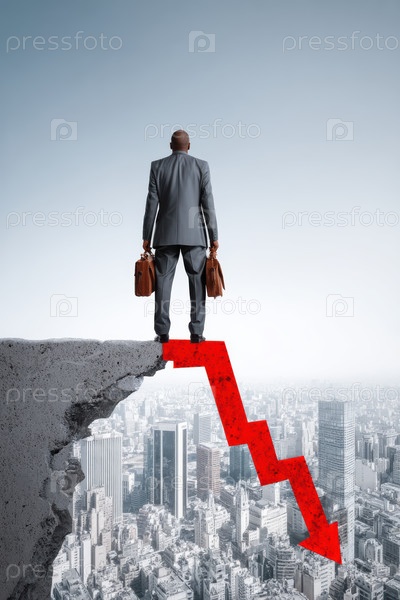 Бизнесмен размышляет о спаде рынка, сидя на вершине городского горизонта, символизируя экономические проблемы