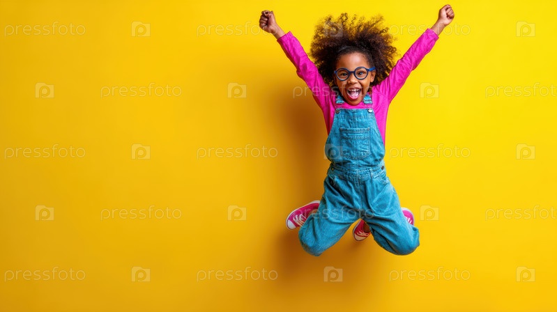 Радостный ребенок прыгает против яркого и веселого наружного фона счастья и энергии