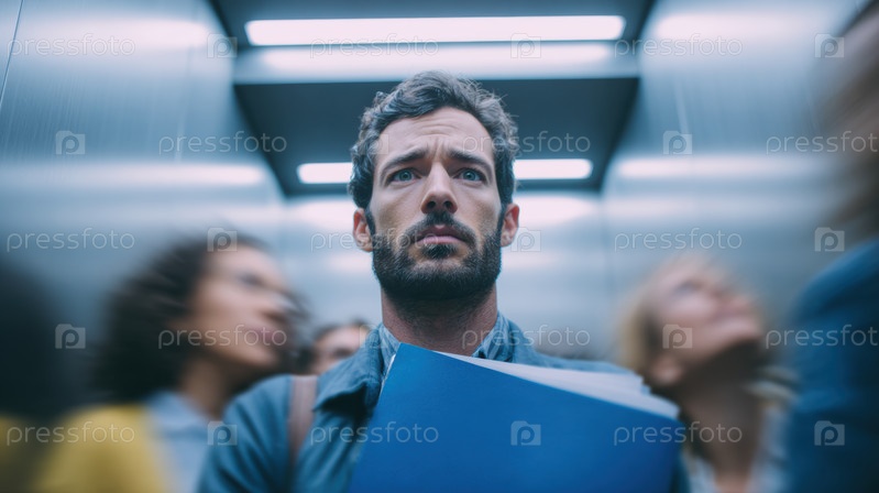 Нервный мужчина стоит в лифте, окруженный своими коллегами и сверстниками, демонстрирующими беспокойство