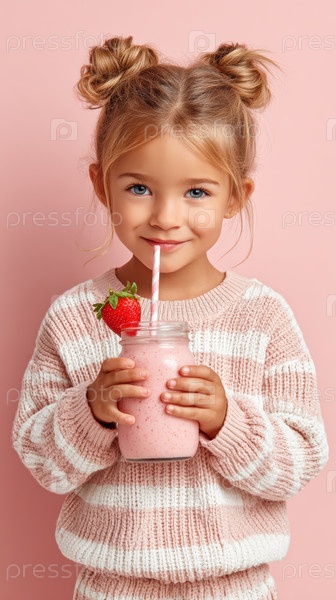 Очаровательная девушка радостно держит вкусный клубничный смузи с яркой улыбкой, идеально подходит для маркетинговых целей
