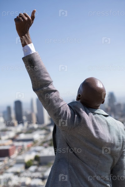Бизнесмен уверенно стоит с распростертыми объятиями, празднуя успех на фоне красивого городского фона