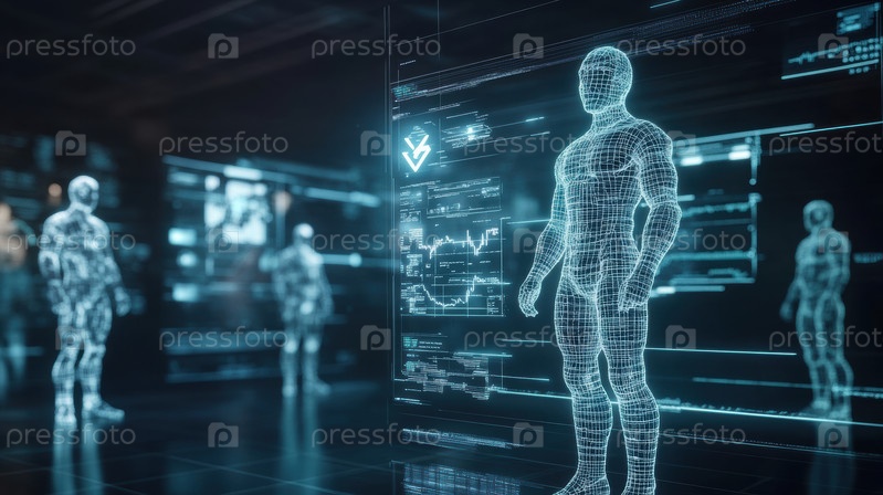 Футуристические цифровые представления человеческих фигур, установленные в высокотехнологичной среде с передовыми технологиями