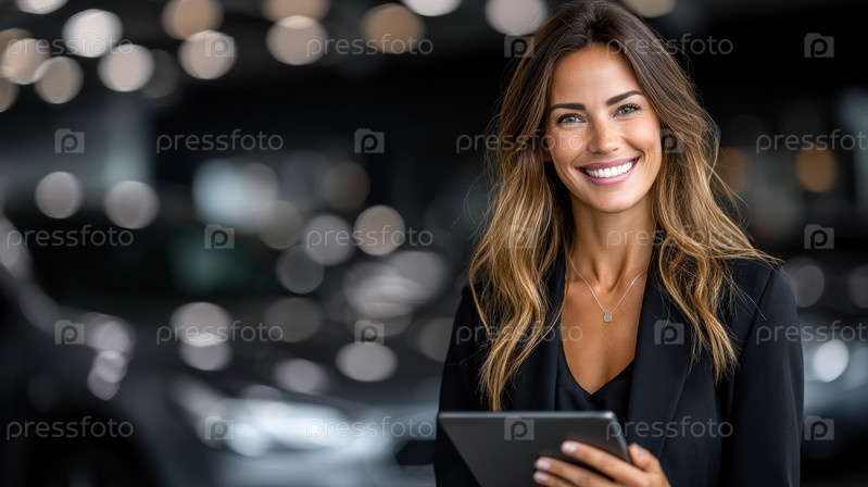 Уверенная в себе деловая женщина улыбается с планшетом у стильного автосалона, демонстрируя профессионализм в своей карьере