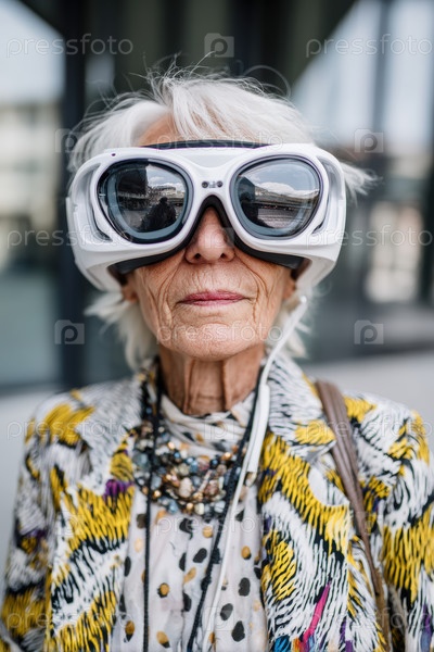 Пожилая женщина погрузилась в виртуальную реальность, нося модный и стильный наряд, который привлекает внимание