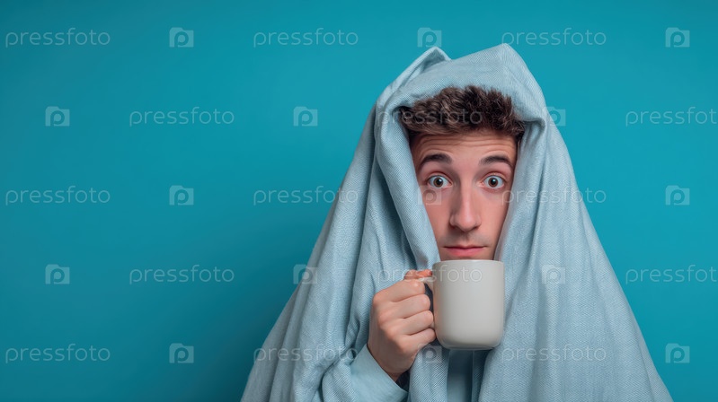 Уютный человек сидит комфортно, наслаждаясь теплым напитком, завернутым в мягкое одеяло