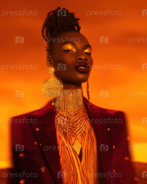 Потрясающая модель демонстрирует яркую оранжевую моду с смелыми аксессуарами на теплом, приглашающем фоне