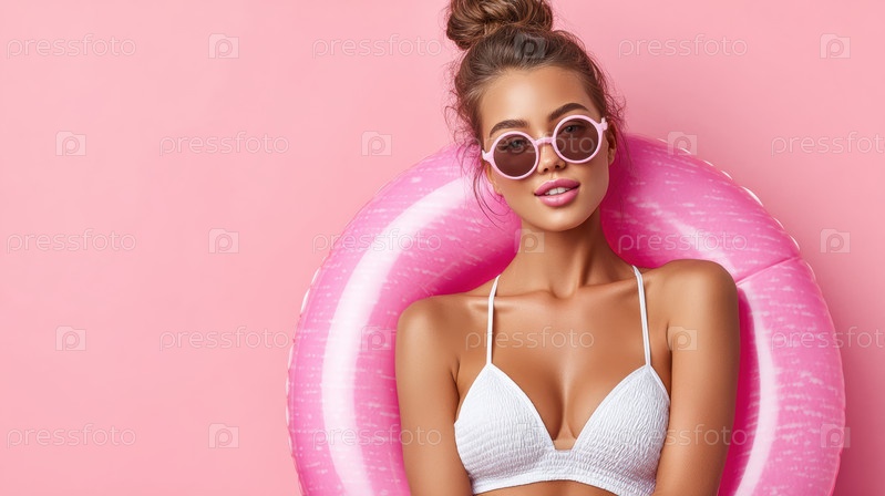 Веселая женщина нежно держащая розовый спасательный бум, обнимает яркие и солнечные летние вибрации, которые окружают ее