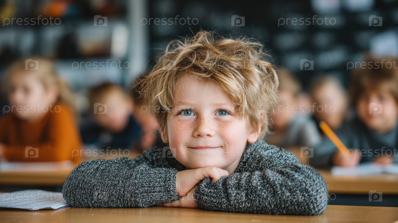 Молодой мальчик сидит в классе, полностью сосредоточенный, стремящийся учиться и демонстрирующий восхитительное любопытство и внимание