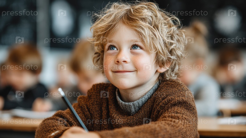 Вдумчивый молодой мальчик в классе глубоко вовлечен в свою учебную деятельность и наслаждается процессом