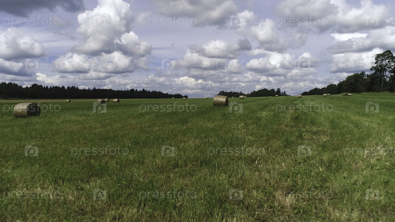 Сельское хозяйство, сенообразовательная концепция, большое зеленое поле на фоне голубого облачного неба. балы сена с сухой травой. со зеленым лесом, растущим далеко в отдалении