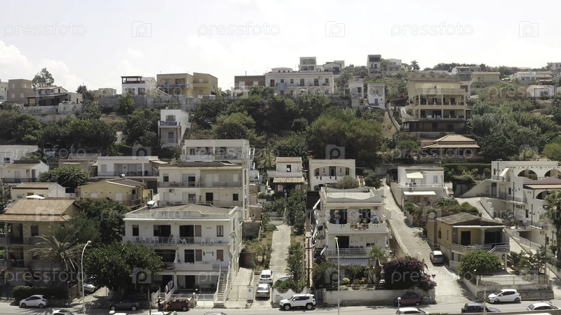 Вид с воздуха на небольшие летние отели недалеко от берега моря против голубого облачного неба в теплый летний день