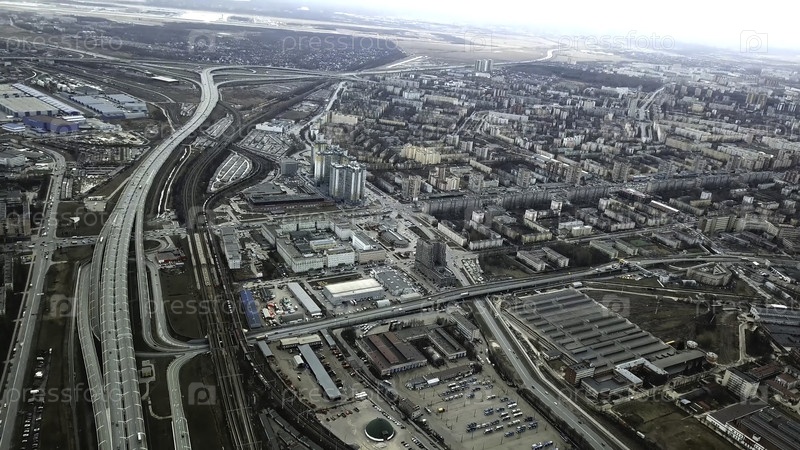 Вид сверху серого мегаполиса. Панорама большого города с районами и проходящей длинной шоссе в пасмурную погоду. Пригородная промышленная часть города на фоне жилых районов