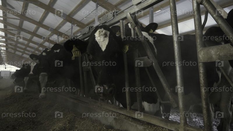 Ближайшее изображение коров, кормящихся в большом коровнике на ферме
