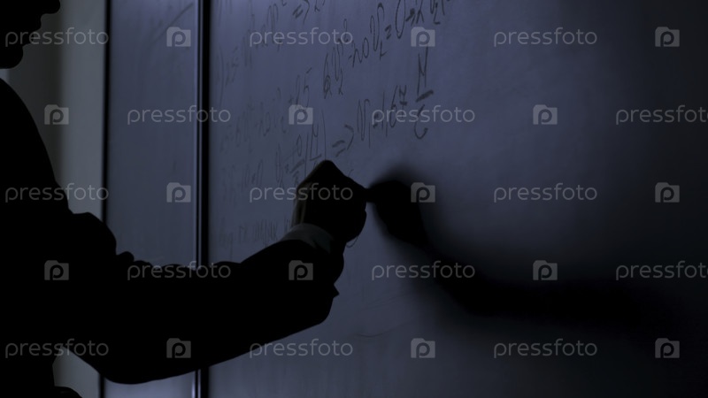 Ученый, пишущий формулы на черной доске.Рука с мелом написала формулы физики на черной доске крупнометражный снимок 4K