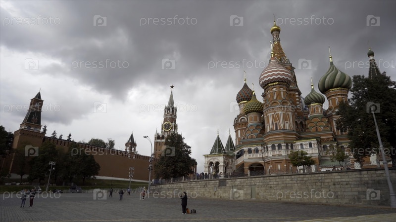 Москва, Россия-сентябрь 2019: Площадь с туристами на фоне красной крепости Московского Кремля. Действие. Российская туристическая достопримечательность в Москве