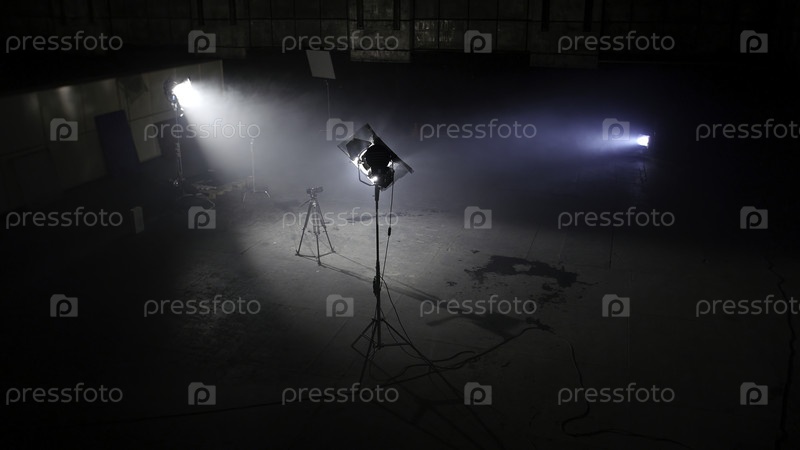 Темная фотостудия со светлыми прожекторами, просторная темная комната с поставленными фонарями и камерой на штативе готовы к профессиональной съемке