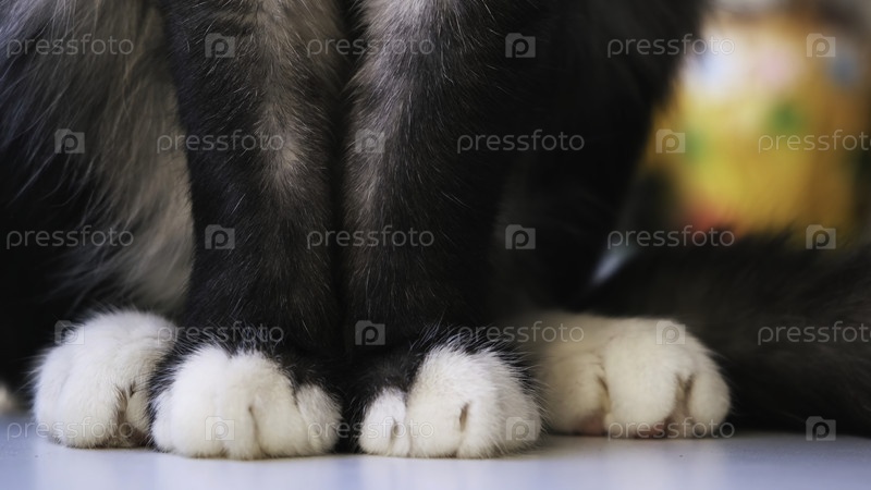 Белые лапы черной кошки на белой плоской поверхности. ближайший снимок красивых кошачьих лап и пушистого хвоста, кот сидит за столом дома на размытом фоне