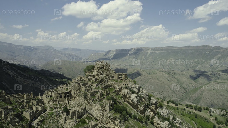 Древний каменный город на скале на фоне гор. Действие. Удивительное поселение каменистых домов на вершине горы. Привлечение Дагестана - деревня призраков в горах