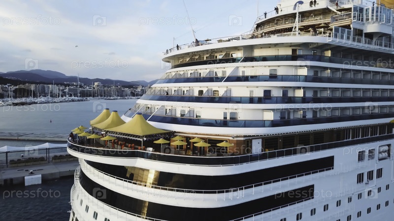Большой круизный корабль, плавающий по морю недалеко от гавани. Сток. Вид сверху огромного круизного судна в море. Концепция летних каникул, путешествия на воде вокруг мира