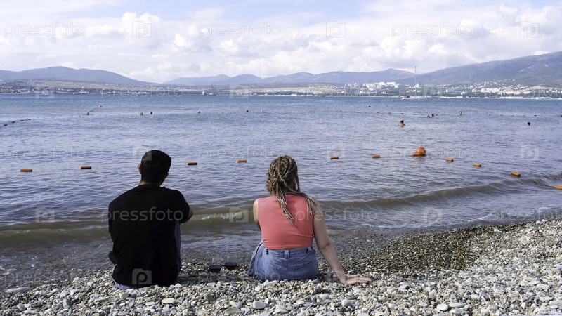 Молодая пара с вином устраивает романтическое свидание на пляже. задний вид девушки со сковородой и парня в черной футболке, сидящих вместе с бокалами красного вина рядом