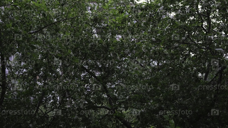 Летняя природа, яблоня с зелеными листьями и белыми цветами, раскачивающимися и белые лепестки летающие на ветре