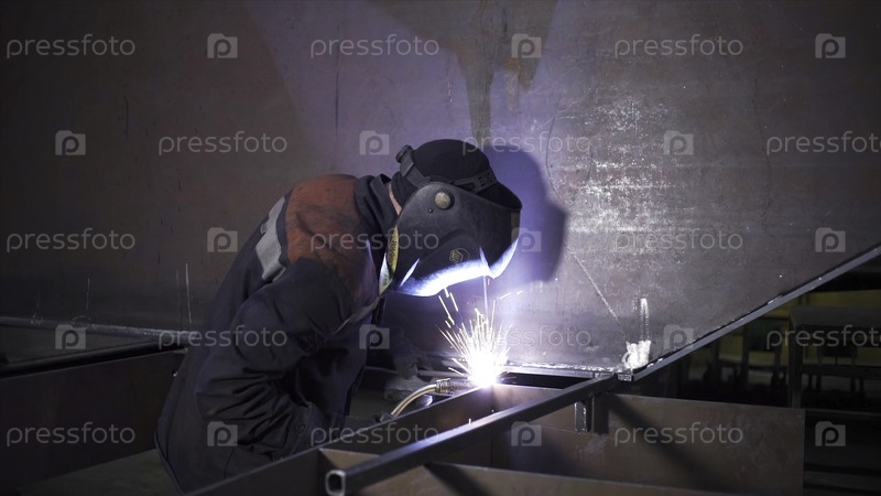 Сварщик работает над металлической конструкцией на фабрике. Клип. Работа с металлом на заводе. Металлургический завод и сварочные работы