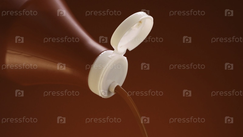 Кетчуп, томатный соус изолирован на красном фоне. Фрагмент кадров. Близкий снимок кетчупа, выливающегося из пластиковой бутылки с белой крышкой, концепция приготовления пищи