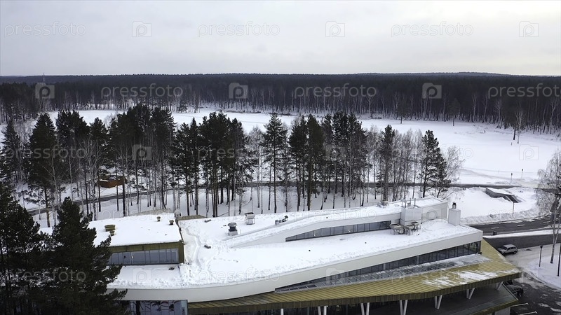 Вид сверху на зимний центр отдыха. Кадр. Красивая база зимнего курорта в окружении деревьев и собравшихся туристов и лыжников