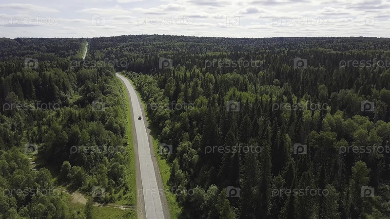 Взгляд с воздуха на белую машину, едущую по сельской дороге в лесу.Взгляд с воздуха летающий над старой исправленной двухполосной лесной дорогой с движущейся машиной зеленые деревья густой древесины, растущие с обеих сторон.Вождение автомобиля вдоль лесно