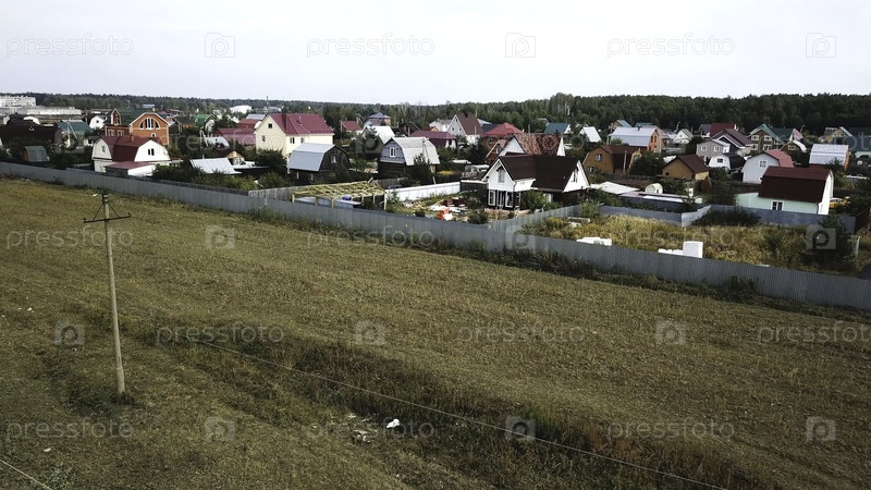 Вид с воздуха на коттеджную деревню возле пустого поля для будущего здания в конце лета против голубого облачного неба