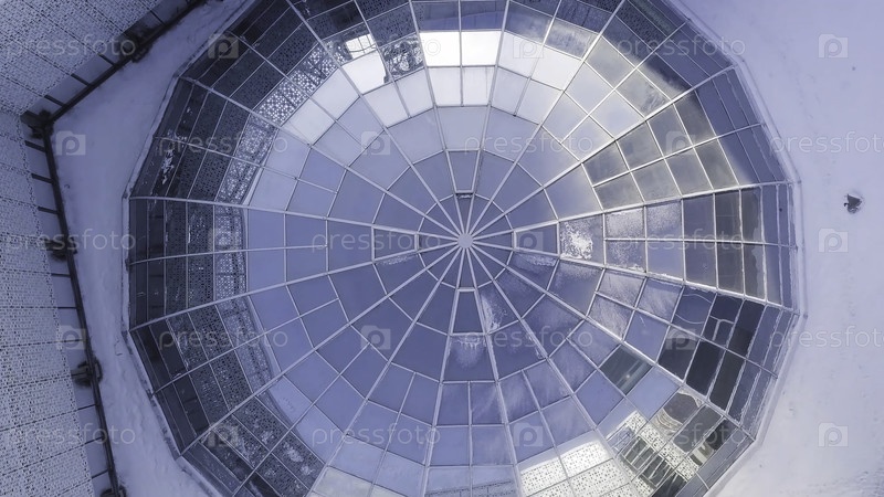 Вид с воздуха на современный стеклянный купол здания. фон стеклового купола. стеклянная крыша в здании. вид сверху на современный радиальный стеклянный купол современного здания