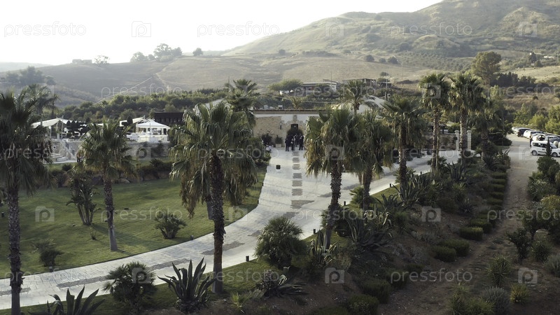 Вид с воздуха гостей, ожидающих медового месяца возле роскошного отеля в окружении зеленых насаждений и пальм на юге