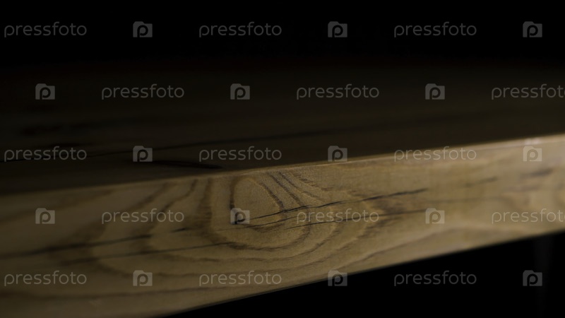 Деревянный стол на черном фоне. Стоковые кадры. Близкий снимок деревянной столовой плиты с полированной светящейся поверхностью в темноте, которая меняется при свете