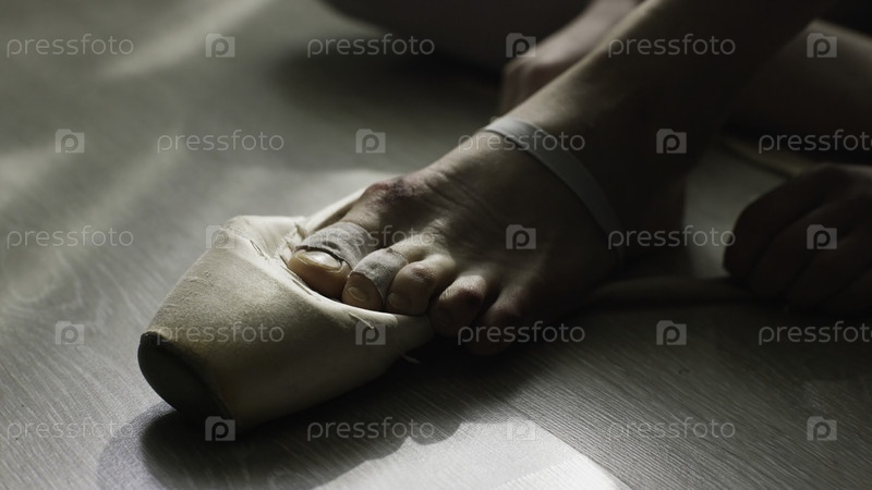 Балерина готовится к тренировке и завязывает ленту из туфель, сидя на полу под ярким солнечным светом