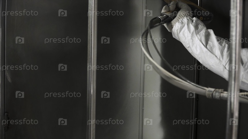 Рабочий на фабрике красит металлические детали пистолетом с порошковым покрытием. Клип. Строительный работник распыляет краски, нося респираторное оборудование безопасности для защиты от выхлопных газов на заводе