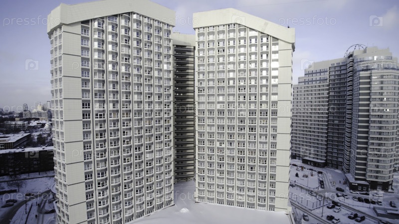 Панорама современного жилого комплекса. клип. высотные здания на закате солнца. корпоративное здание в городе