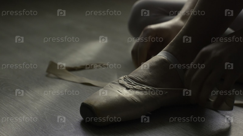 Танцовщица, завязывающая обувь балета перед тренировкой
