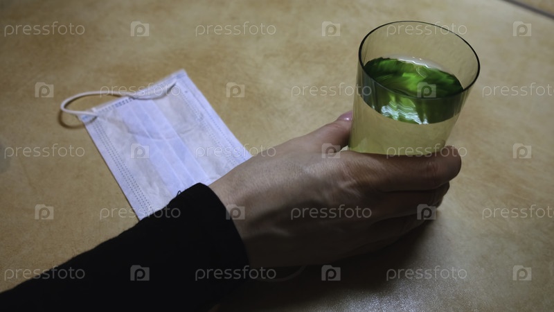 Круглый план женщины, принимающей таблетки и стакан воды со стола, а затем надевающей медицинскую маску