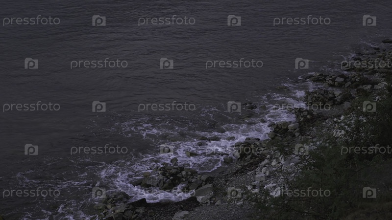 Скалистый берег моря или реки. СМИ. Камни, смытые маленькими волнами, вечерний природный ландшафт с галечным побережьем, растущие зеленые кустарники и море