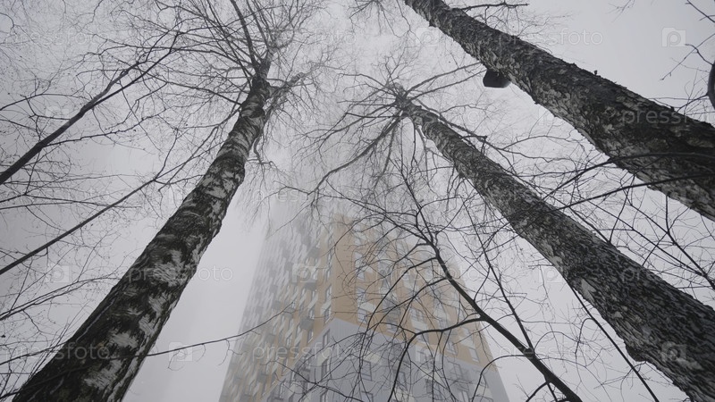 Березовые деревья в тумане. действие. таинственный туман окутывает зиму березы. пасмурная зимняя погода в пригородной роще с туманом