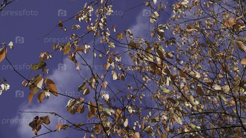 Золотые, желтые и оранжевые листья дуют ветром над голубым облачным небом на осеннем фоне