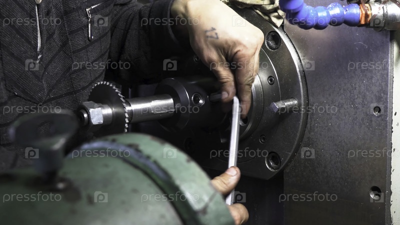 Механик-ремонтник на заводе, регулирующий машину с помощью большого и тяжелого ключа, держа его обеими руками
