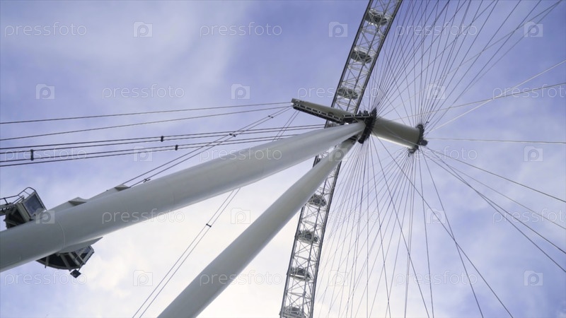 Нижний вид современного колеса обозрения на фоне синего неба. Действие. Колесо обозрения не работает в ясный день. Многие линии соединены в колесе обозрения