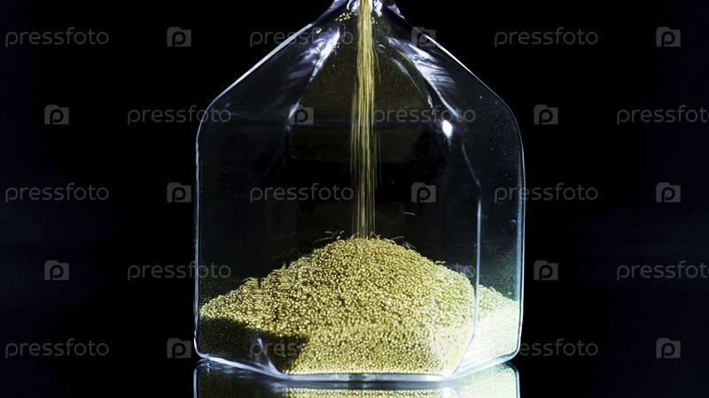 Близкий план золотых песочных часов. Скриншоты. Стильные шестиугольные песочные часы с падающими золотистыми пятнами на черном изолированном фоне. Прохождение времени и важность каждого зерна